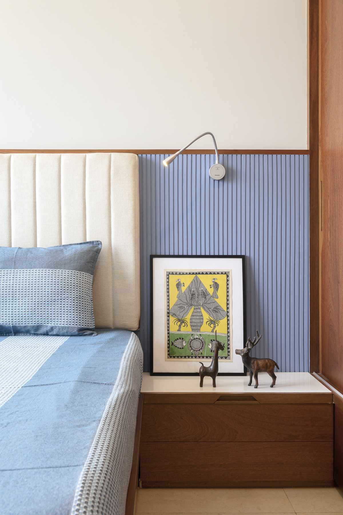 The corridor ceiling dips down as it leads towards the bedrooms - again a functional necessity from air conditioning lines crossing over to the internal ducts, but made a virtue of, by the dip signalling entry to the private spaces of the home. The bedrooms have storage beds finished in veneer and ribbed paneling to either side. Wardrobes are a combination of sliding glass panels and timber sliding doors with elongated flush timber handles.