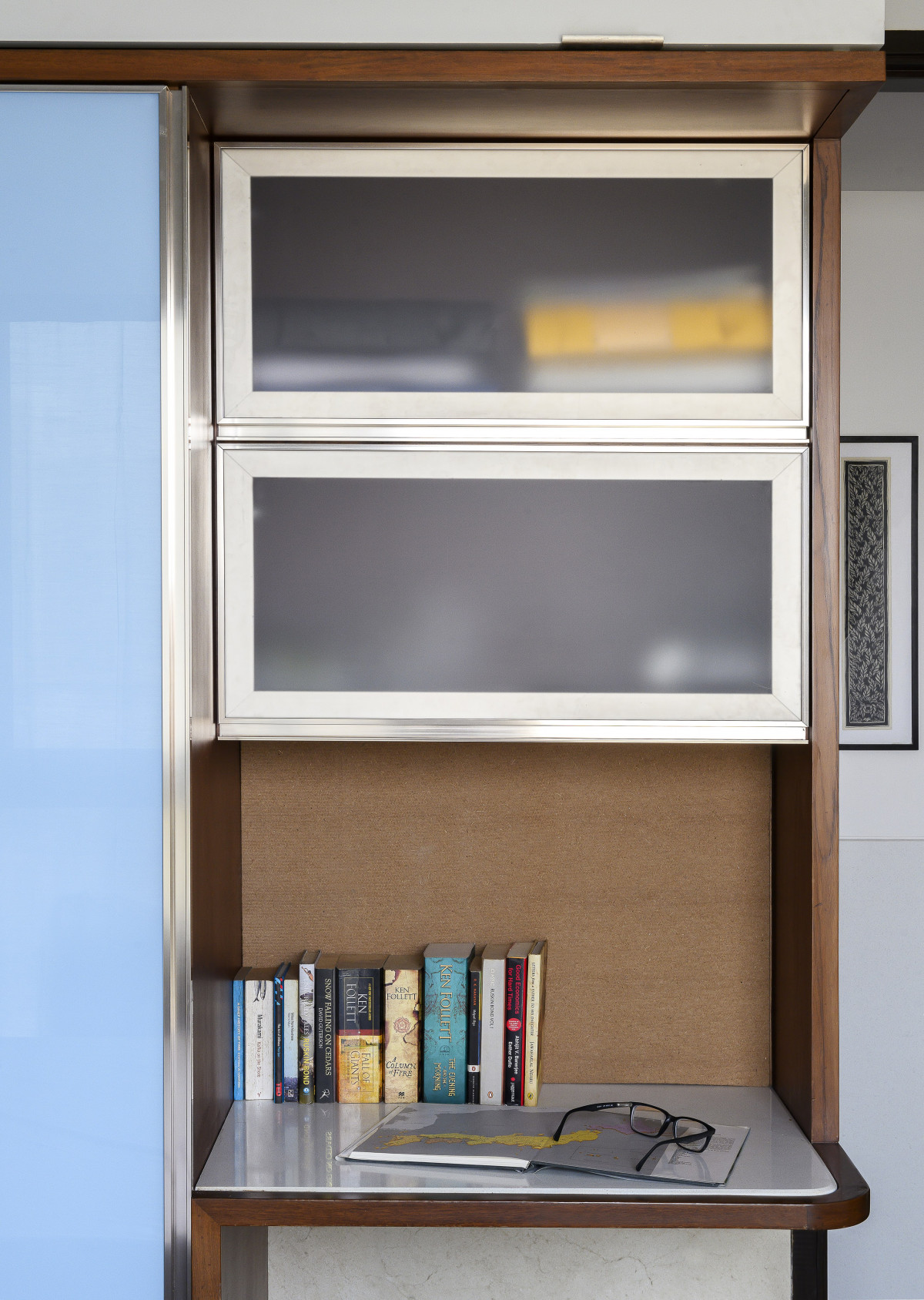 The unit is finished in a rich mahogany veneer and soft beige fabric for the seating. The second unit comprises a fold-down dining table counter, a serving desk, utility storage and a wall filled with photographs of Aazad compiled by an artist friend. A subtle language of flush timber pulls, camouflaged storage spaces and stone counter tops ensures utility with a touch of elegance.