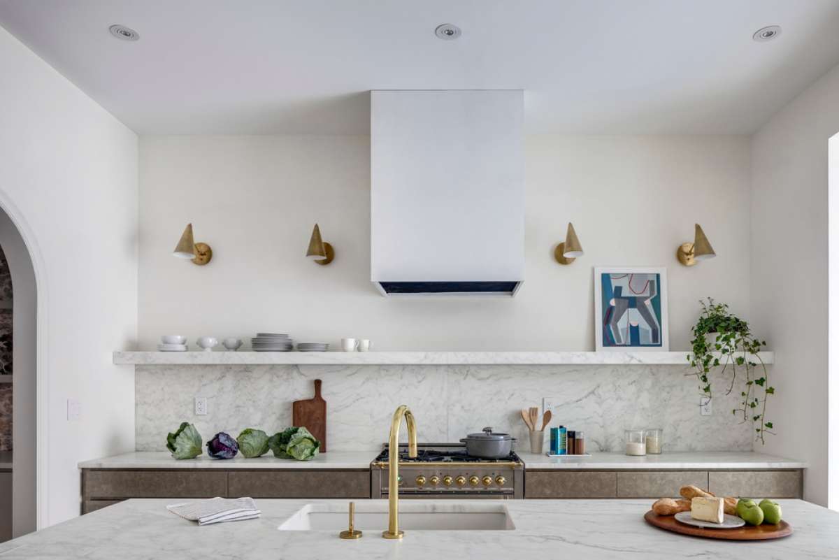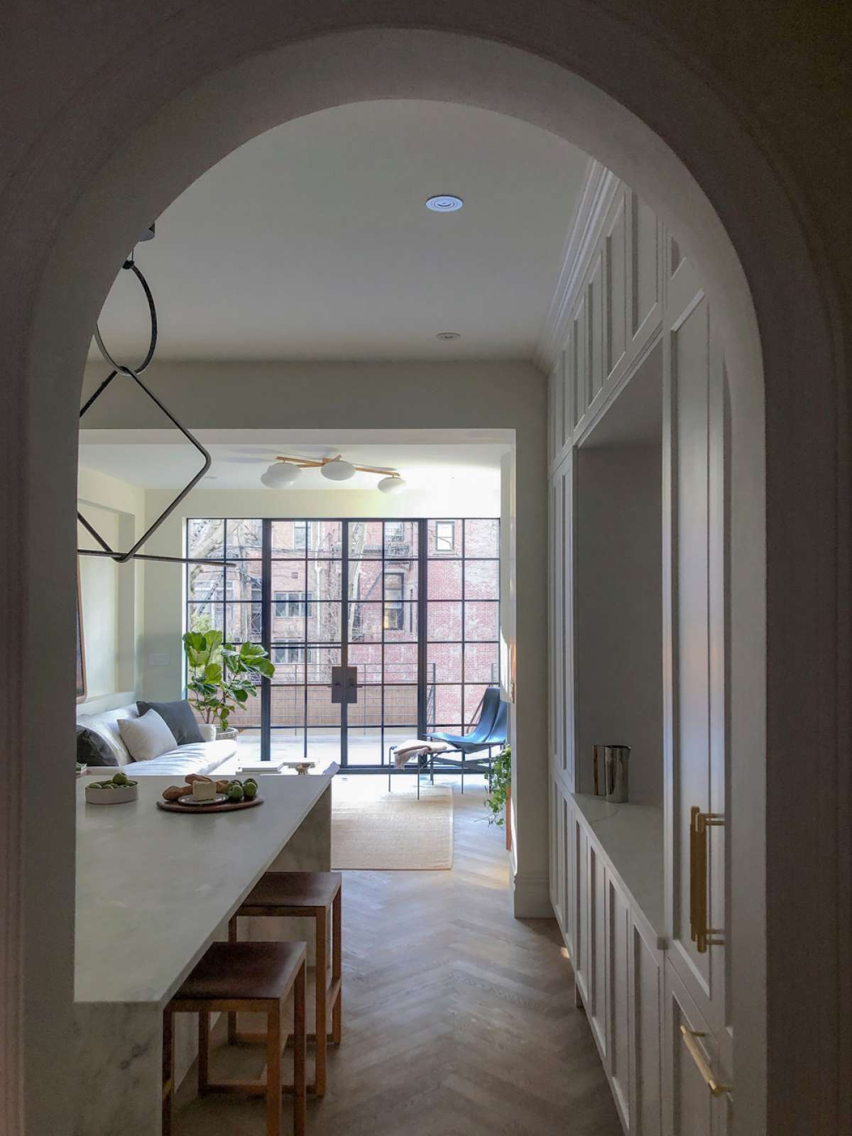 The house’s signature arched doorway and front window were the inspiration for much of the detailing for the renovated spaces. Arched openings connect the dining space to the foyer as well as to the kitchen through a butler’s pantry. The generous kitchen spans the entire width of the house and is designed for socializing while cooking, with a large central marble island and extensive countertop space. The ceilings were raised on the parlor floor to visually and spatially open out the space toward the rear yard, which is framed by a full wall of steel doors and accessed from a rear deck. The centerpiece of the living room is a plaster fluted fireplace surround.
