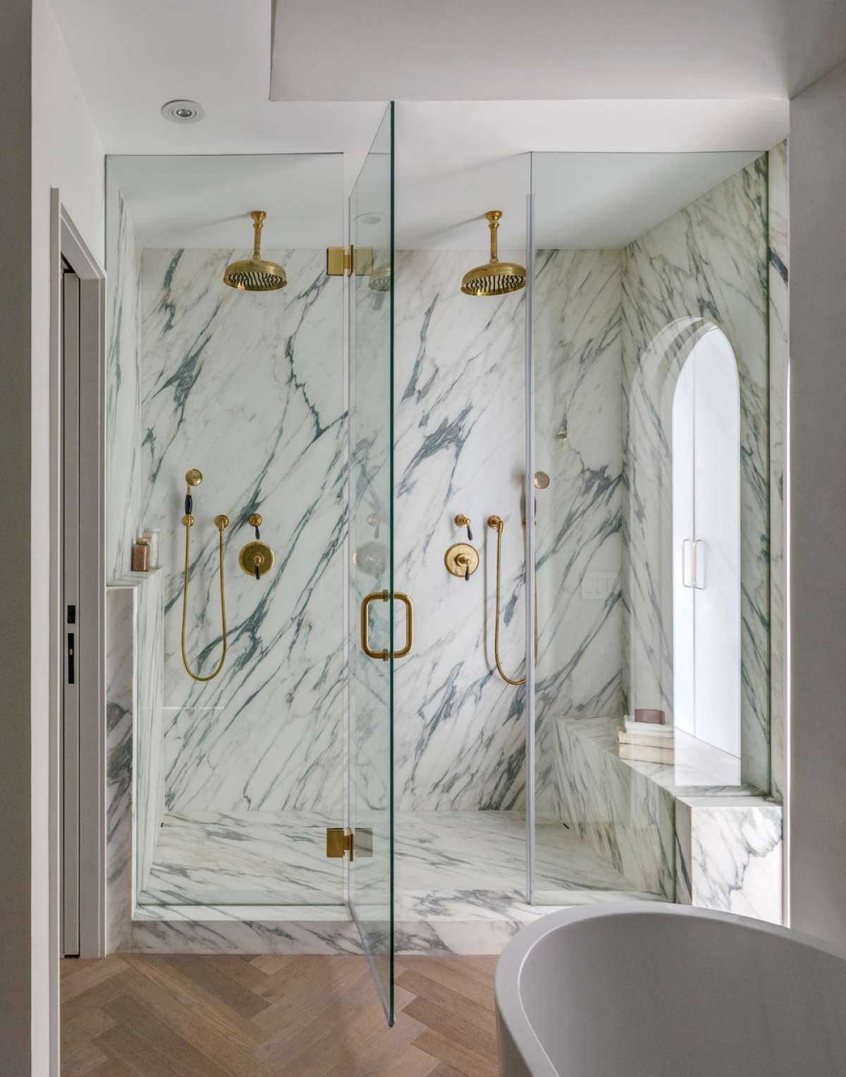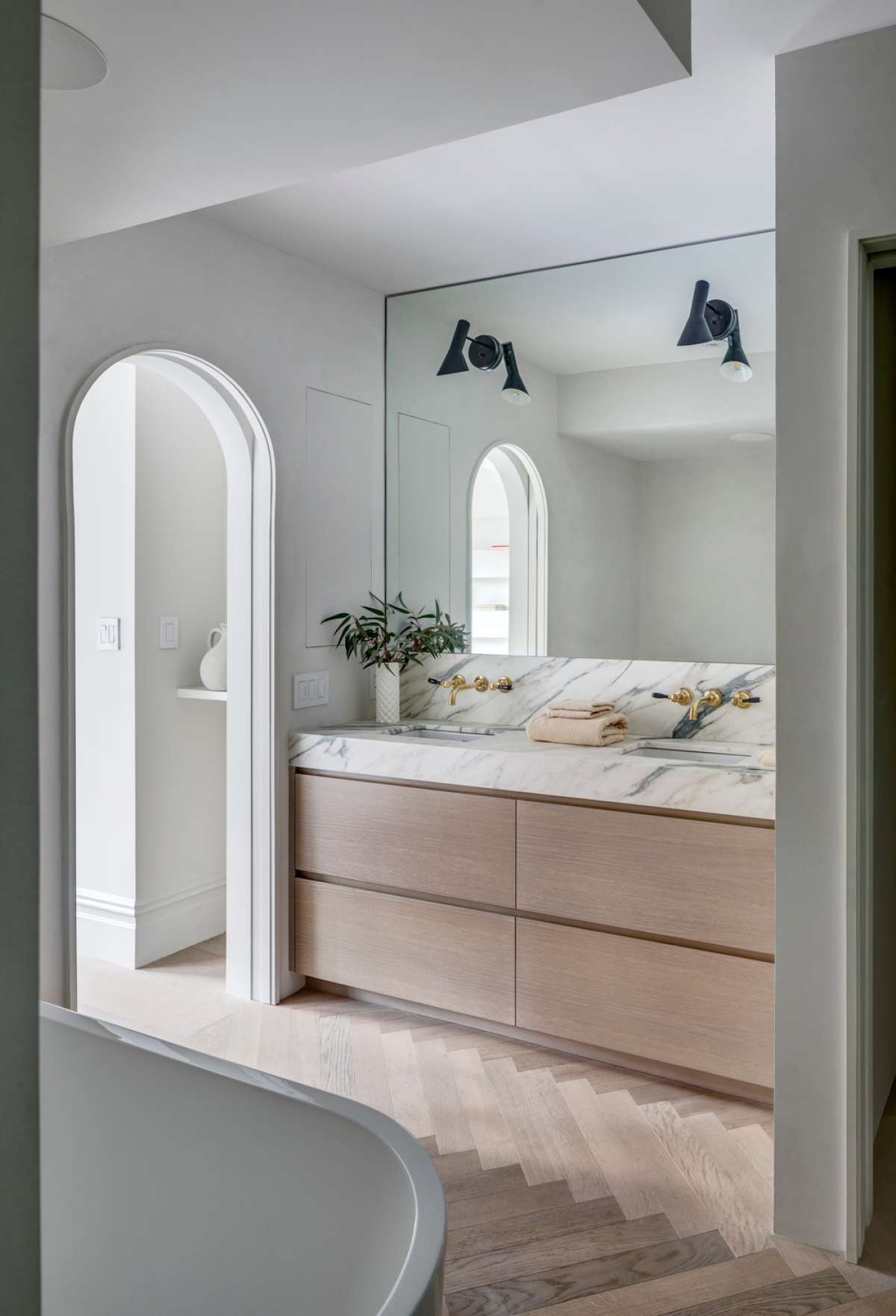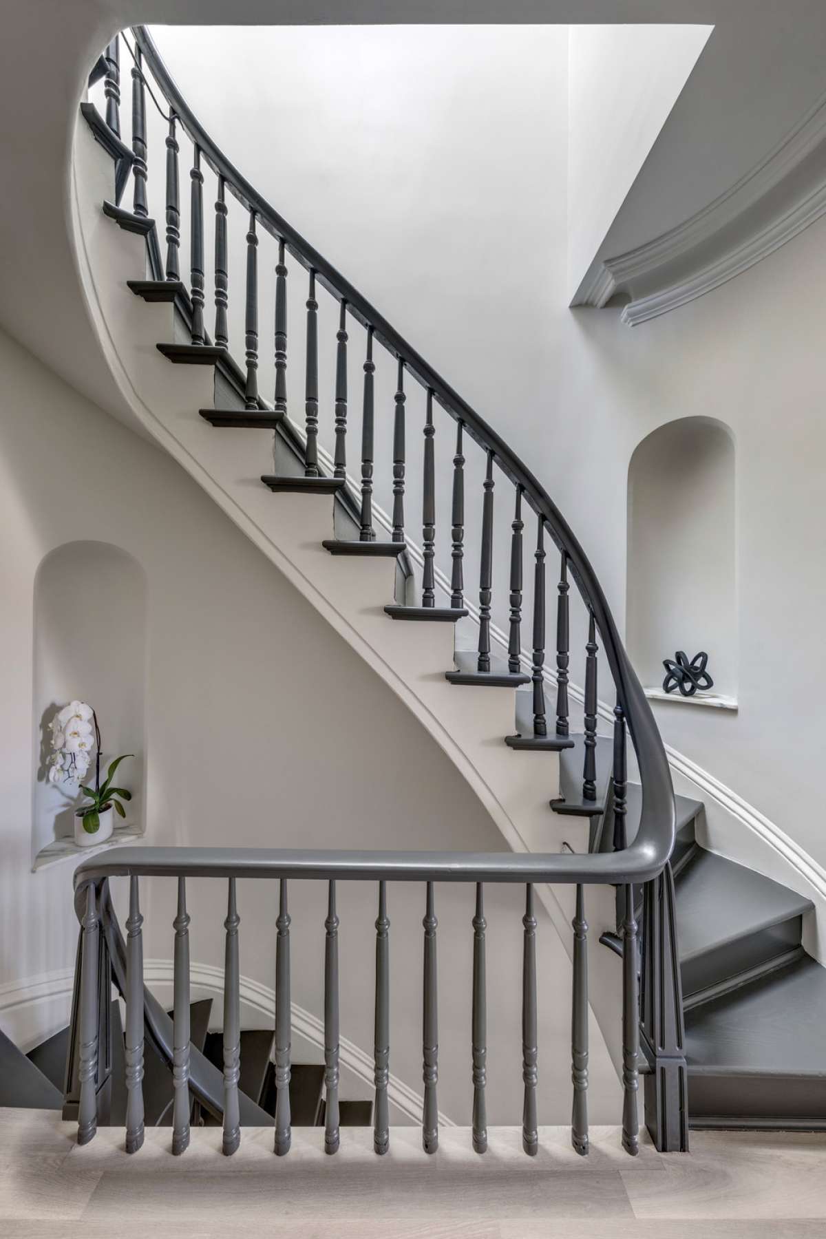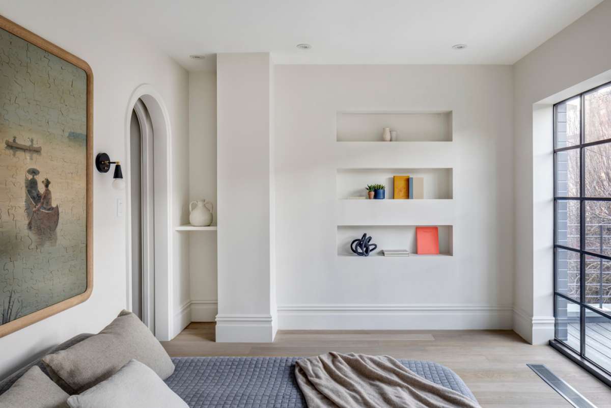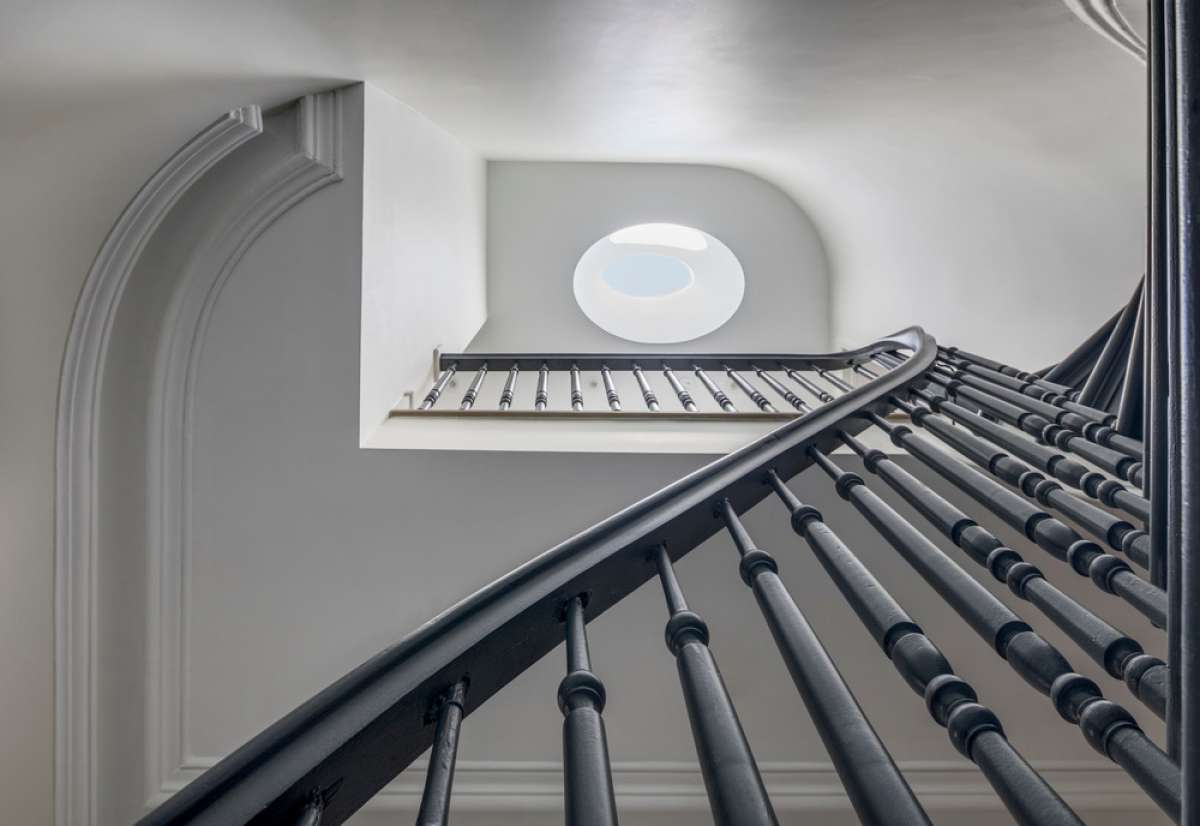 The existing wood stair and handrail were restored and the skylight above was replaced in the shape of an oval to match the geometry of the stairwell. The master suite occupies the second floor. A library and office with original moldings and fireplace overlook the street. The bedroom, a plaster, and marble master bath are sequestered through more arched openings via a raised passageway toward the rear. The bedroom opens onto a balcony through more steel doors. The third floor is configured as a level for children, guests, and caregivers.