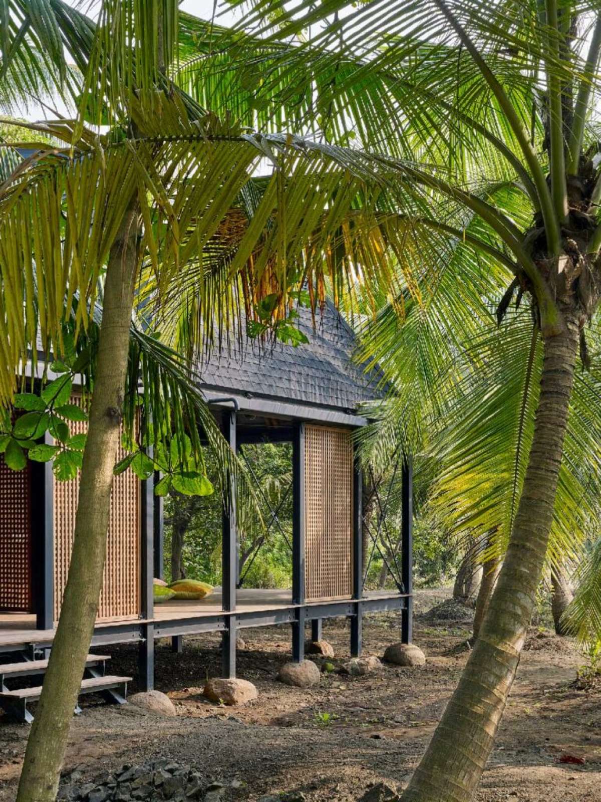 While the stilts, columns and beams are made in galvanised steel, the roof structure is built of bamboo V-shaped beams. Indian bamboo often suffers from irregular shapes and diameters. In order to avoid the natural irregularity of the bamboo from becoming distractive, the layout of the rafters follows a zig-zag pattern. However it also increases the strength of the structural frame. While the framework is exposed from the inside, on the exterior a lightweight roofing of cement sheets cover the bamboo framework.