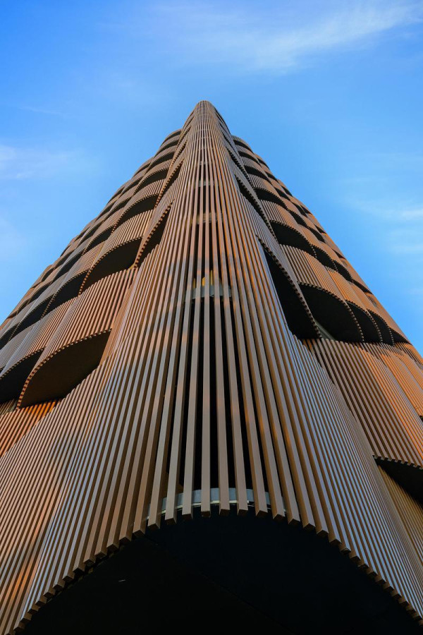 The Observatory, located on the third circular platform, has two exhibition spaces. It offers a dreamy view from the inside and out. The lightweight polycarbonate cylindrical façade filters and reflects the hues of the water and greenery. The visitors' silhouettes cast through the façade's carefully designed openings create an artistic spectacle.