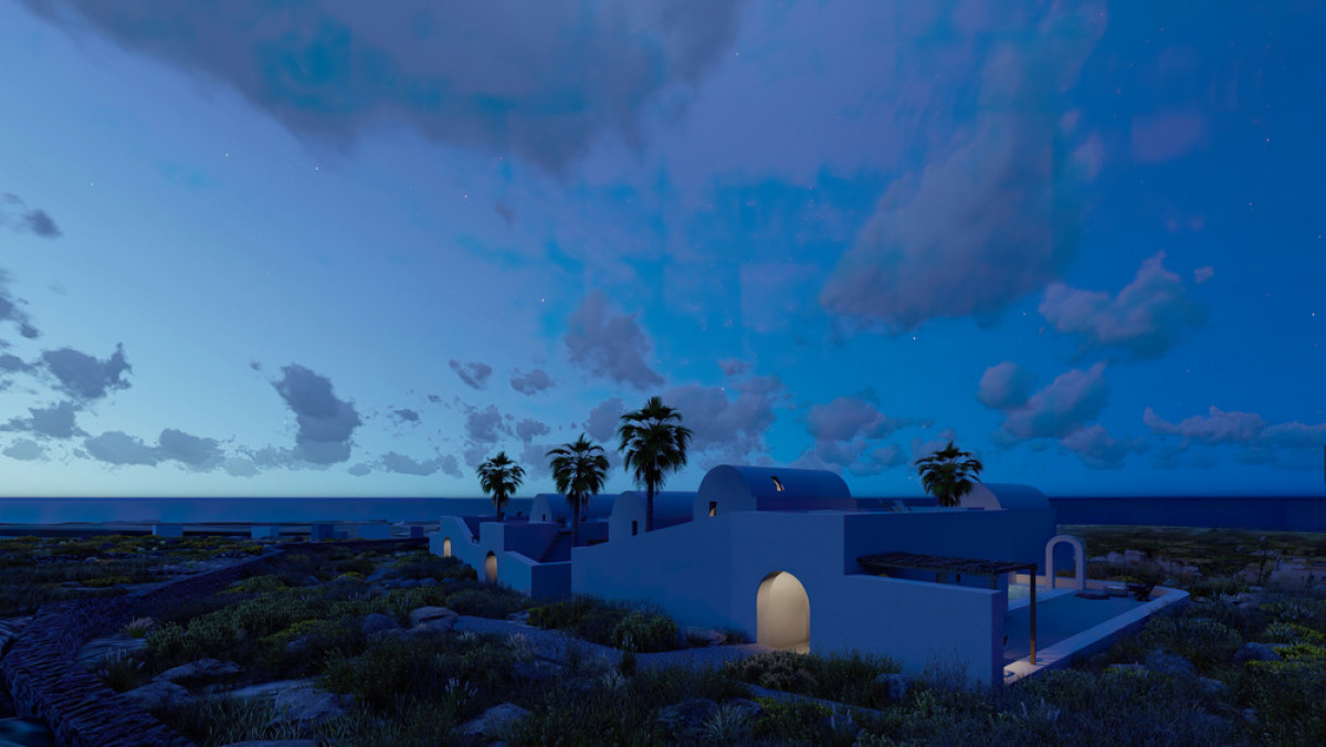 The main objectives of the design are the protection from the northwest winds, the view of the sea and the Mediterranean volcanic landscape, and the accomplishment of privacy among residents. The rocky plot faces north and is exposed to strong northwest winds that dominate the area. The goal of the design was, through the division of the main building volume into smaller ones, to create a number of outdoor spaces protected from the winds, but presenting views of the sea and the Cycladic landscape. The cubical houses follow the slope of the plot, creating a settlement resembling traditional ones located in the countryside of the island.