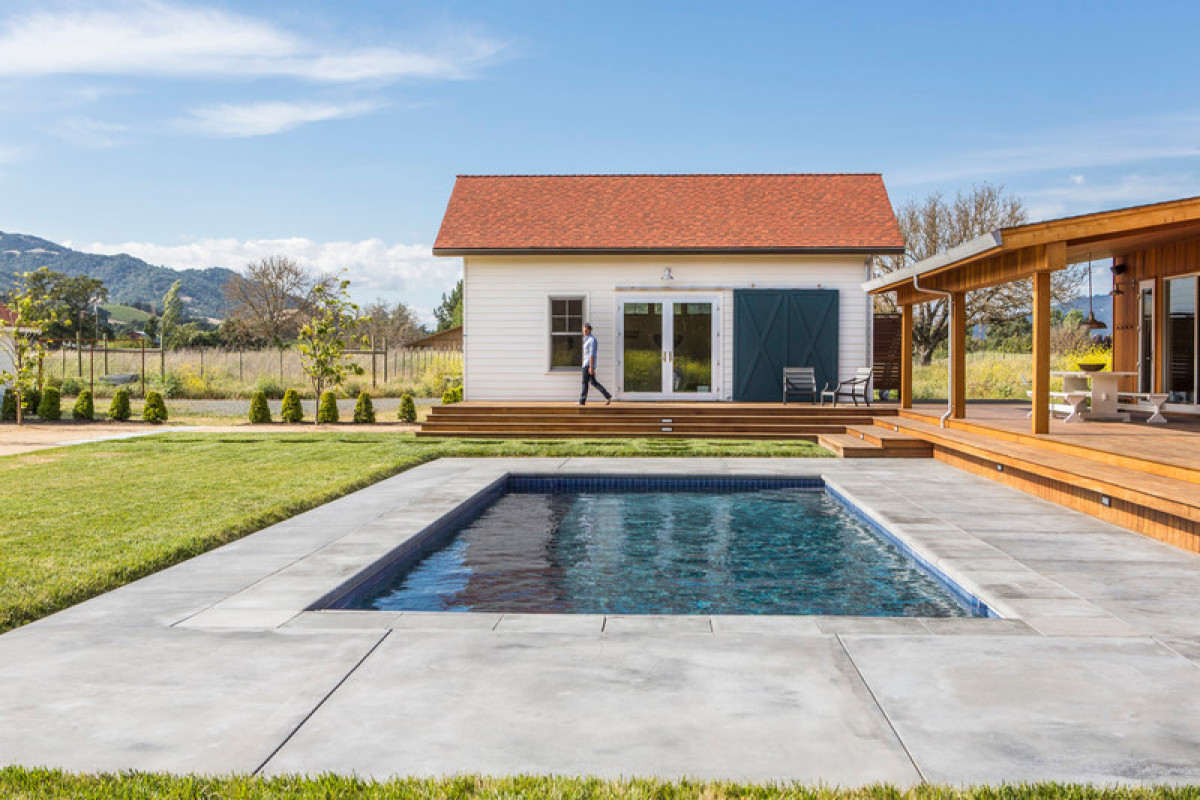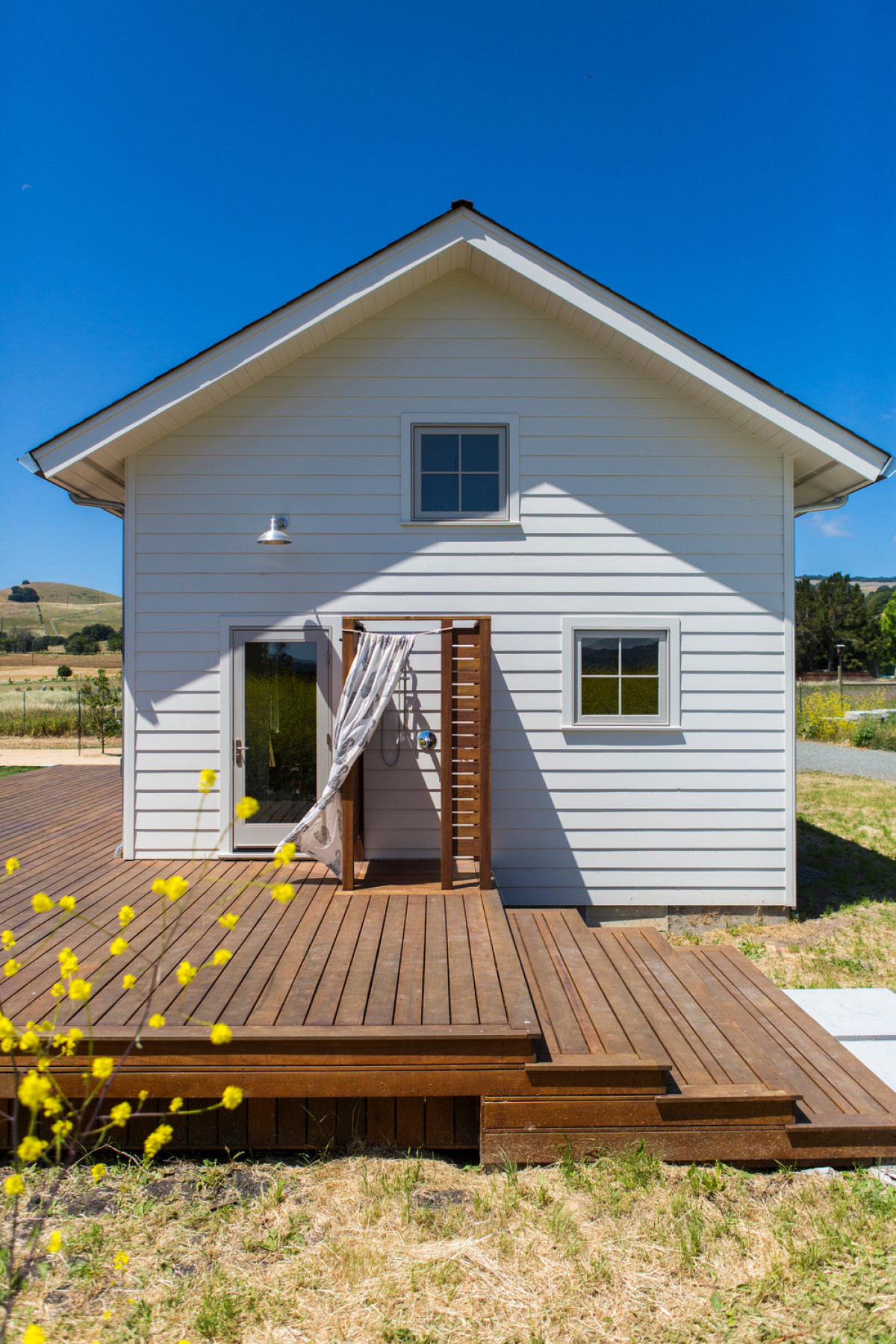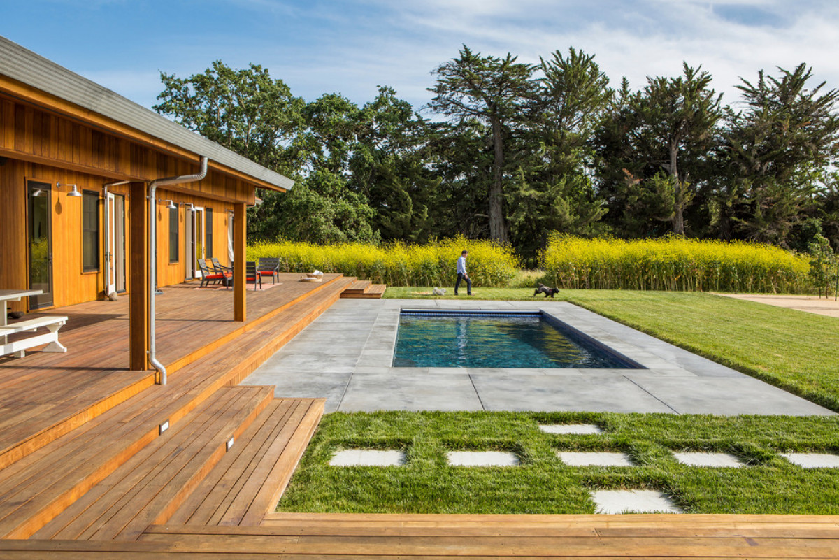 Carlson designed this farmhouse-inspired weekend getaway for his family in Sonoma. Located on a former walnut orchard, the 1,885 SF house—along with a 600 SF barn which functions as a studio for his artist wife—captures the experience of California camping. Like farm buildings in the area, the house sits humbly on the landscape. Carlson sited the house along an east-west axis to allow for natural light throughout, and all rooms in the house have access to the outdoors. An L-shaped wood deck connects the house and the barn, while a covered porch was sited to create a cool place where one can escape the heat of the summer afternoon sun.