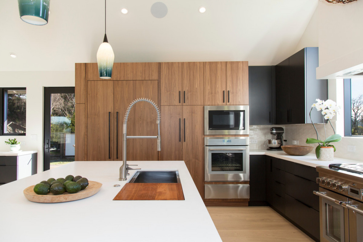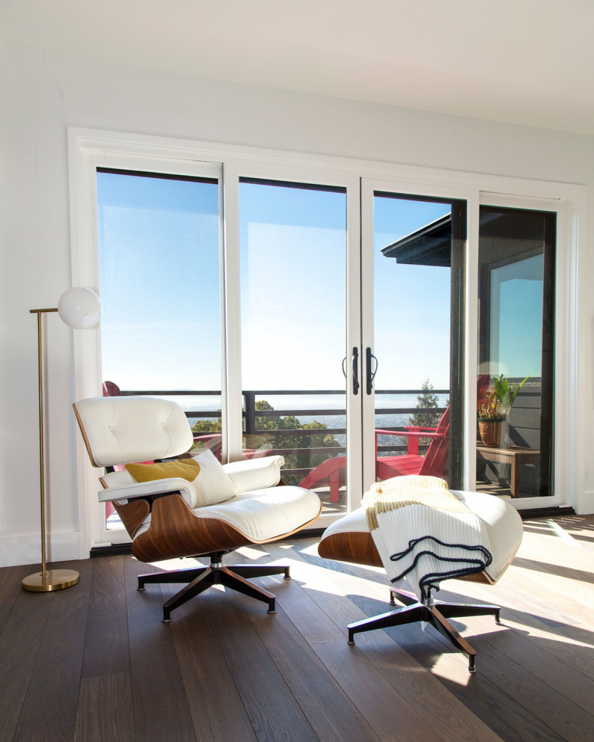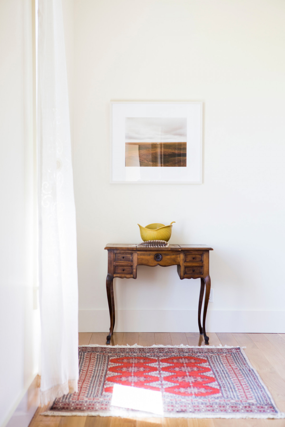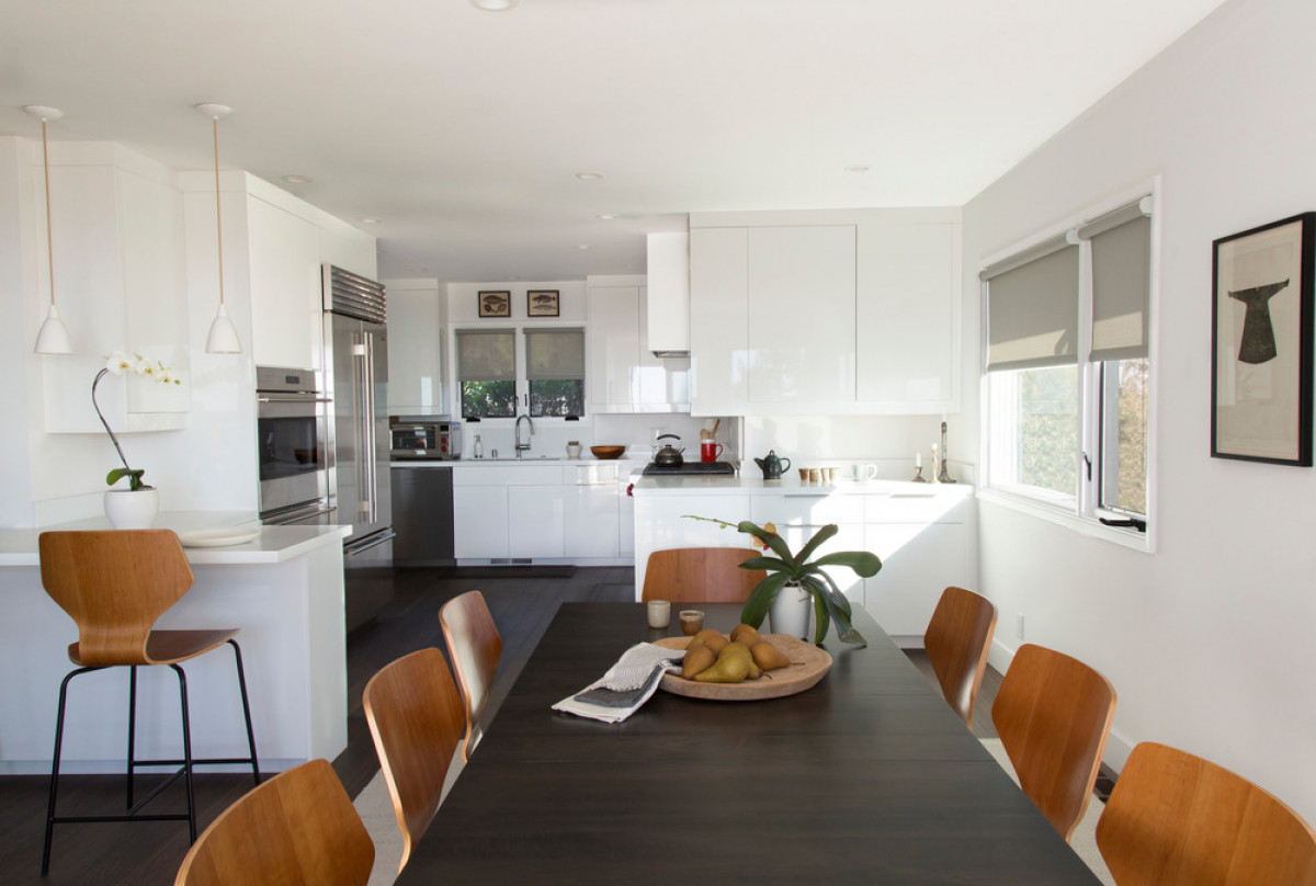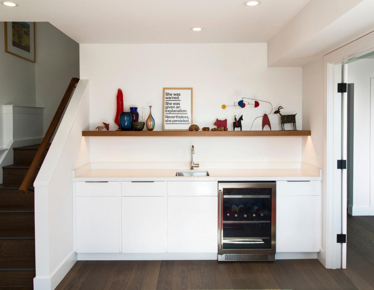 Inspired by the homeowner’s desire for a white kitchen and a light-filled environment, Carlson opened up the spaces of this modestly-sized 1950s Ranch-style house, while using red as an accent. The homeowner’s personal art collection is showcased on walls and on the fireplace. Carlson and builder, Scott Harrison, share a love of cooking and gardening, which provided common ground for solving design problems. The homeowner — an engineer with a large San Francisco firm— is preparing for retirement in the light-filled house. An avid art collector, home cook, and gardener, she moved from her former dark wood-panelled Craftsman house to this home, where she can enjoy stunning views every single day.