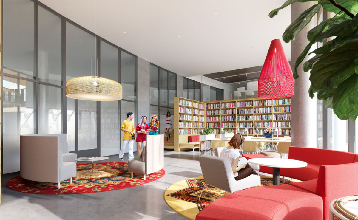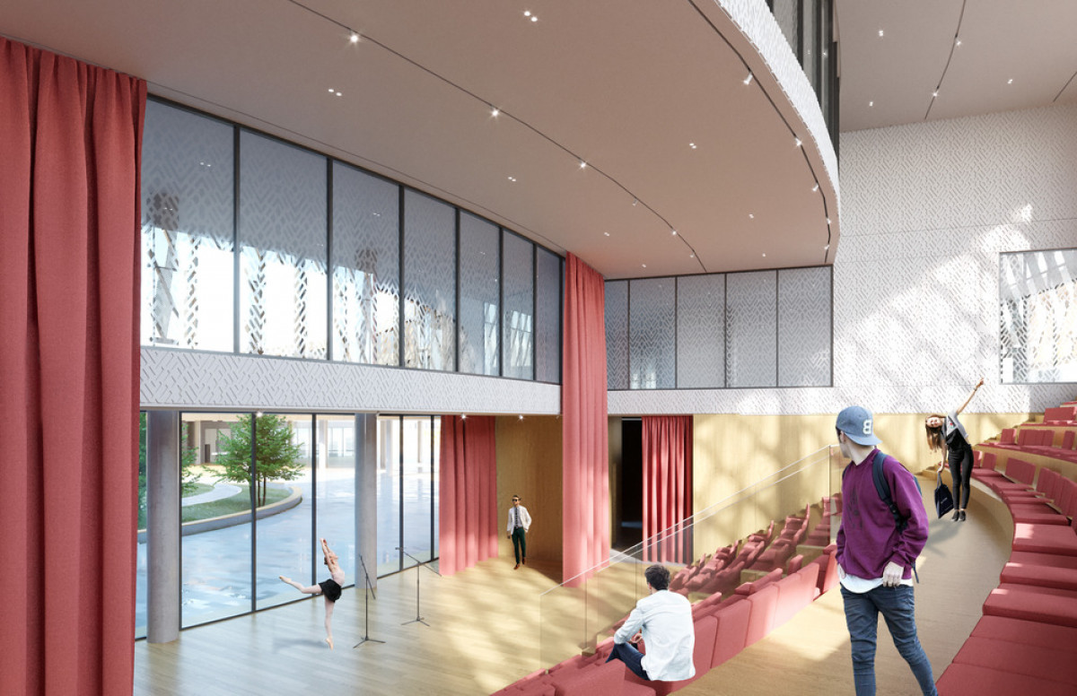 The central core serves as the main "square" of the building. This space serves as a lobby and a forum, as well as a place for recreational activities, and the area allows for the placement of stands for organized exhibitions of student creativity.