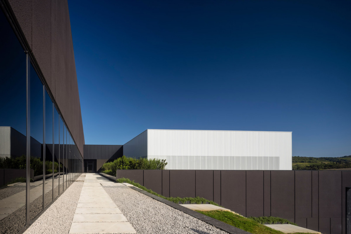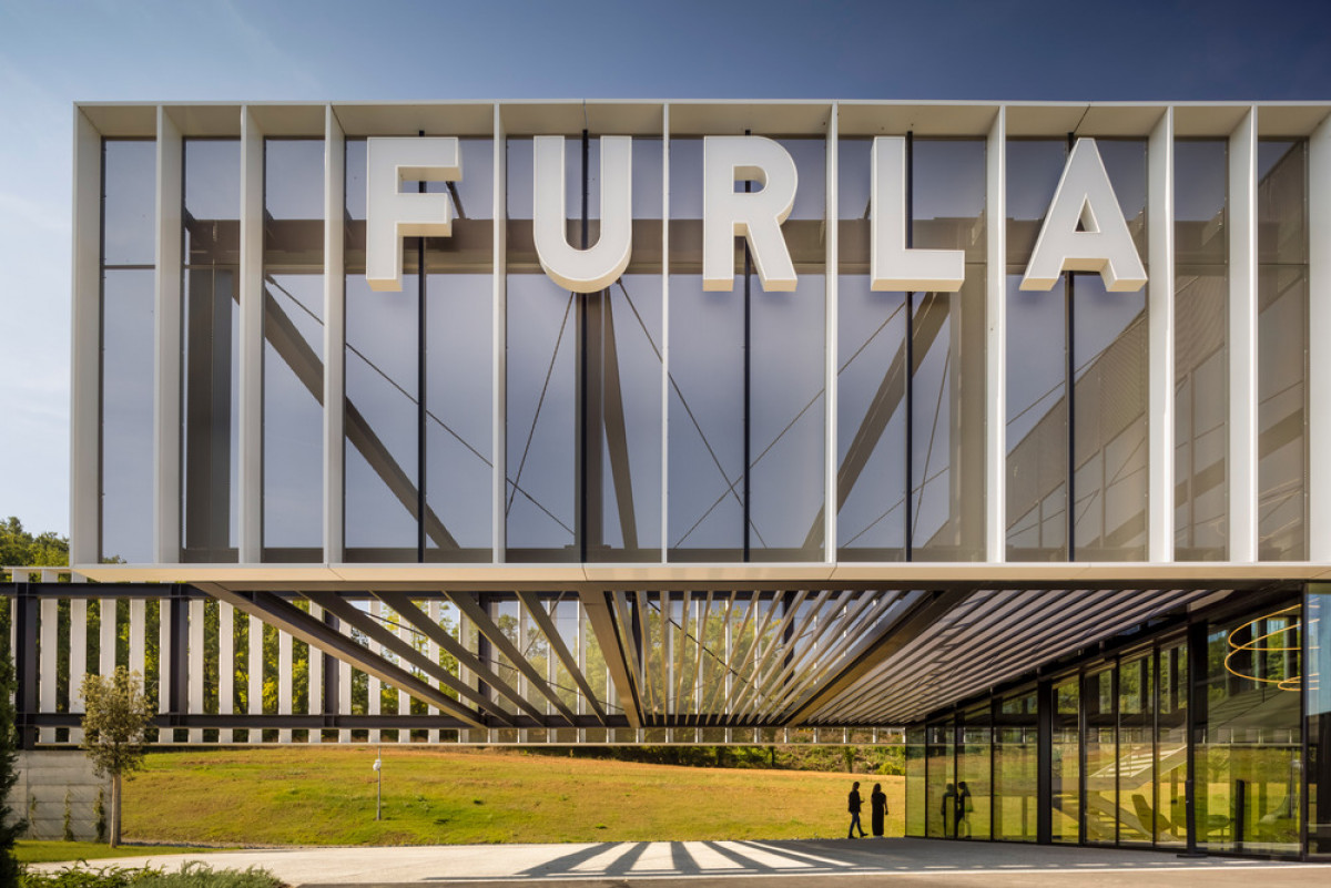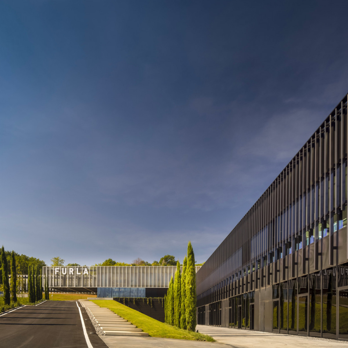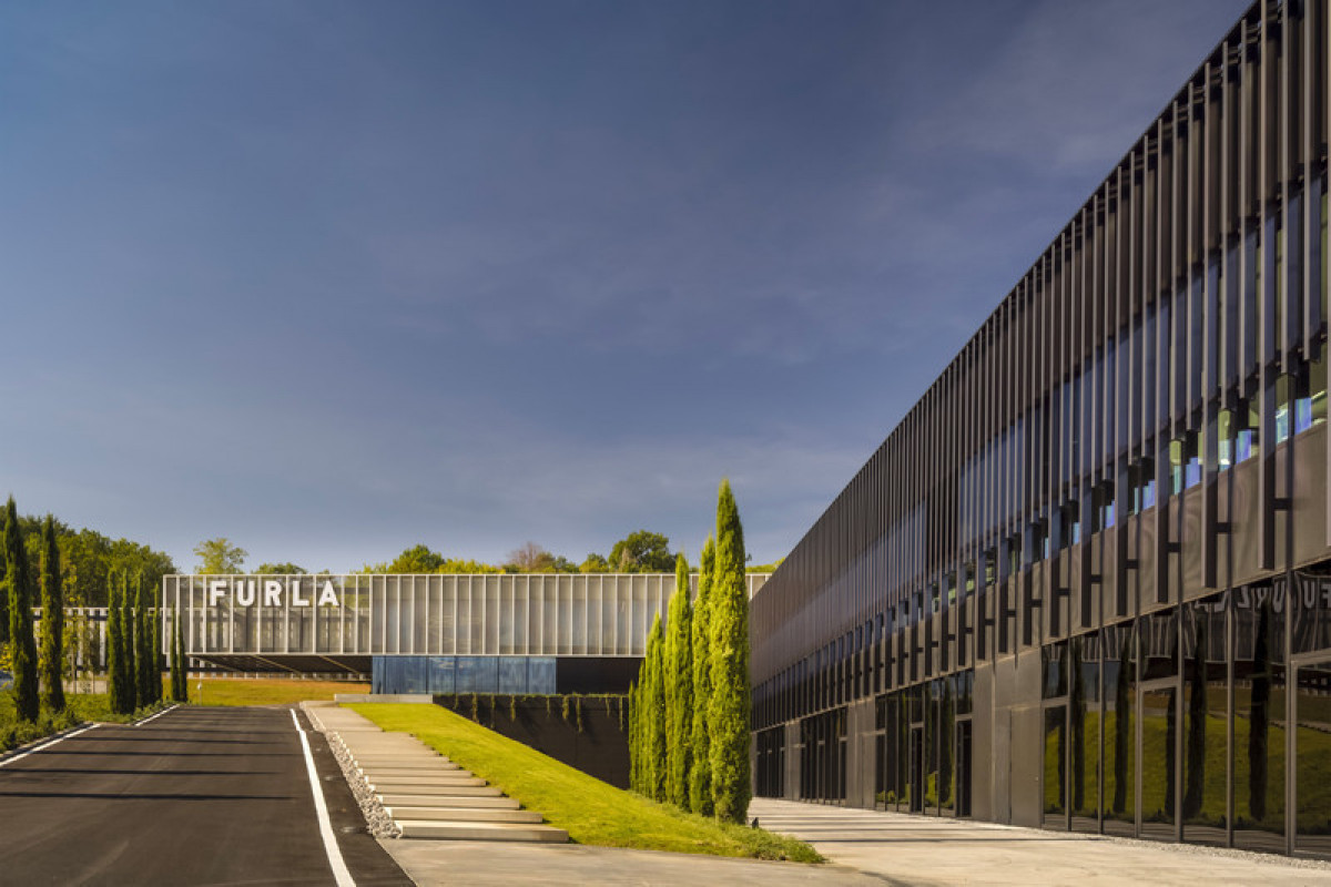 The Furla factory covers 42,000 sq m of soil - 18,300 sq m built - and has three main volumes (one for offices, two for labs and logistics) designed to be harmoniously integrated into the surrounding landscape, without too much contrast. Architecture and nature coexist in a functional balance.