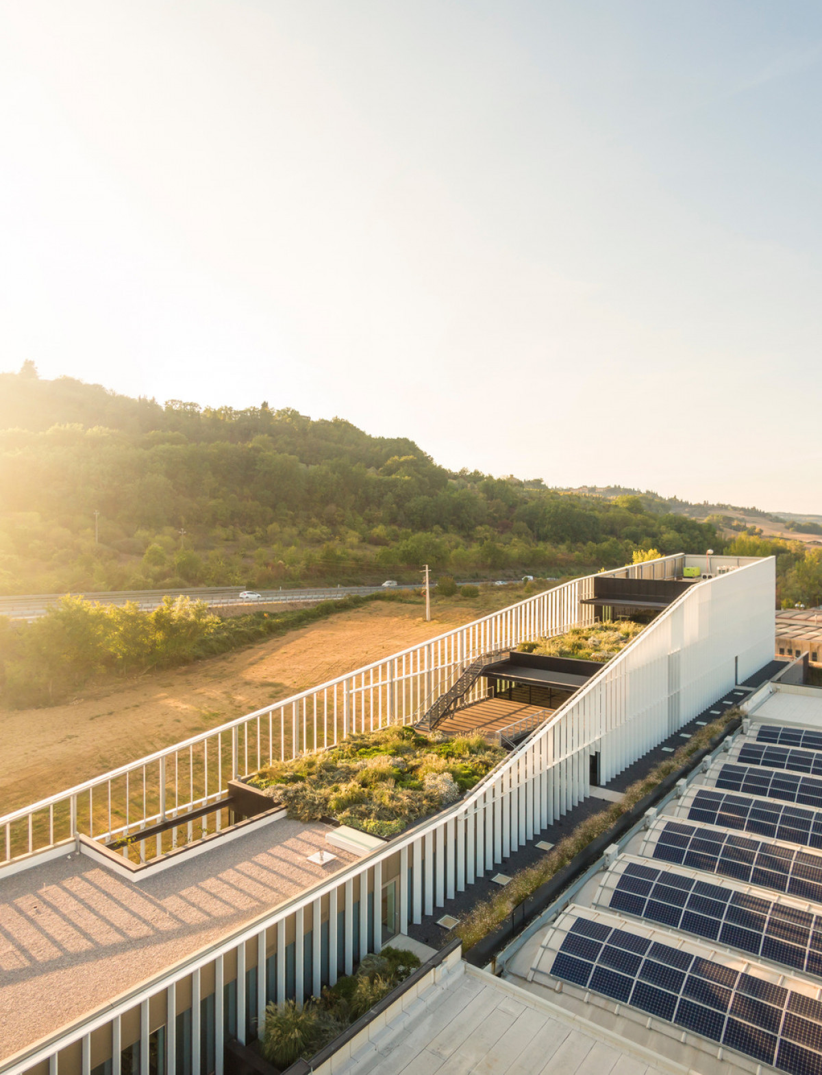 Nature is a prominent element, not just because of its beauty (Chianti hills), but also because it creates a pleasant environment once blended into the building: patios, green coverings, and natural light contribute to a more sustainable working habitat, where people can also relax and enjoy contact with nature.