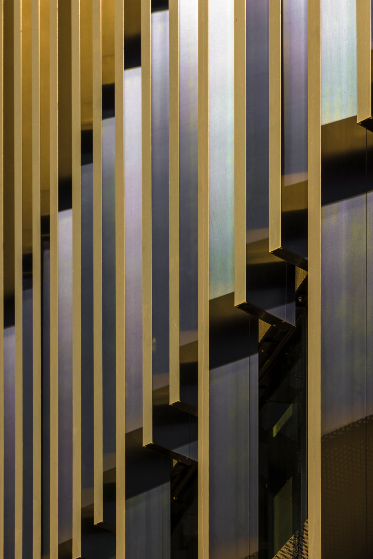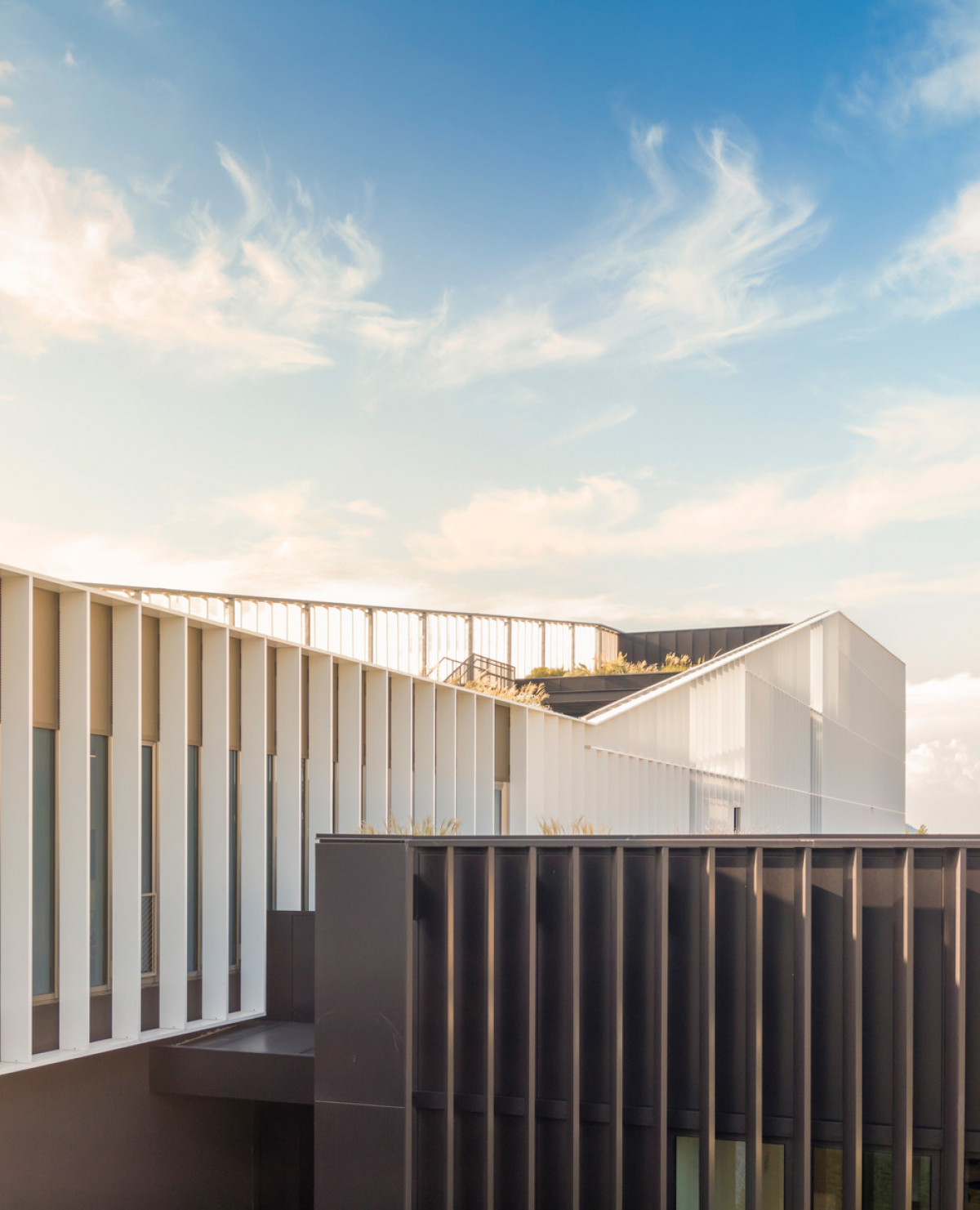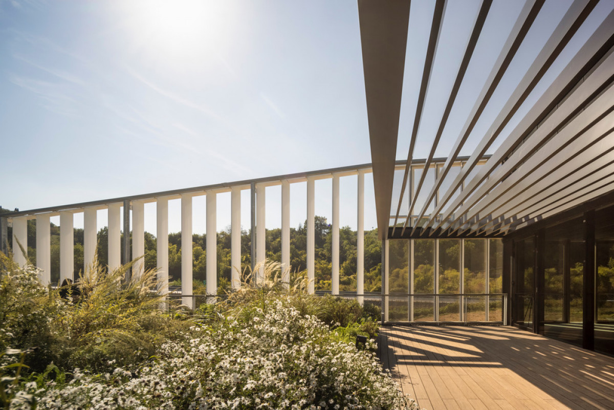 The morphology of the land is truly taken into consideration and is enhanced through three fundamental elements – the driveway, the terraces, and Piazza Furla – which define clear areas around the building volumes. Thanks to a system of patios and green roofs overlooking the wooded area, nature crosses the boundaries between inside and outside. The main entrance recalls the archetype of Tuscan villa access: a linear row of cypresses welcoming visitors and showing the way through. This rhythm is replicated on the facade of the buildings with sunscreen filtering blades.