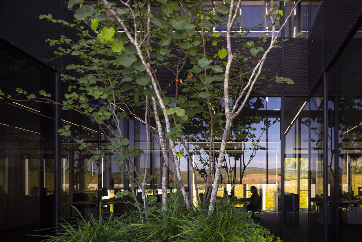 The entrance to the offices, with the double-height reception and the large open-air hall, becomes the point where the boundaries between architecture and landscape merge. The interiors have been designed in such a way as to have real layout flexibility. The orderly sequence of offices is punctuated by green patios, or relationship spaces.