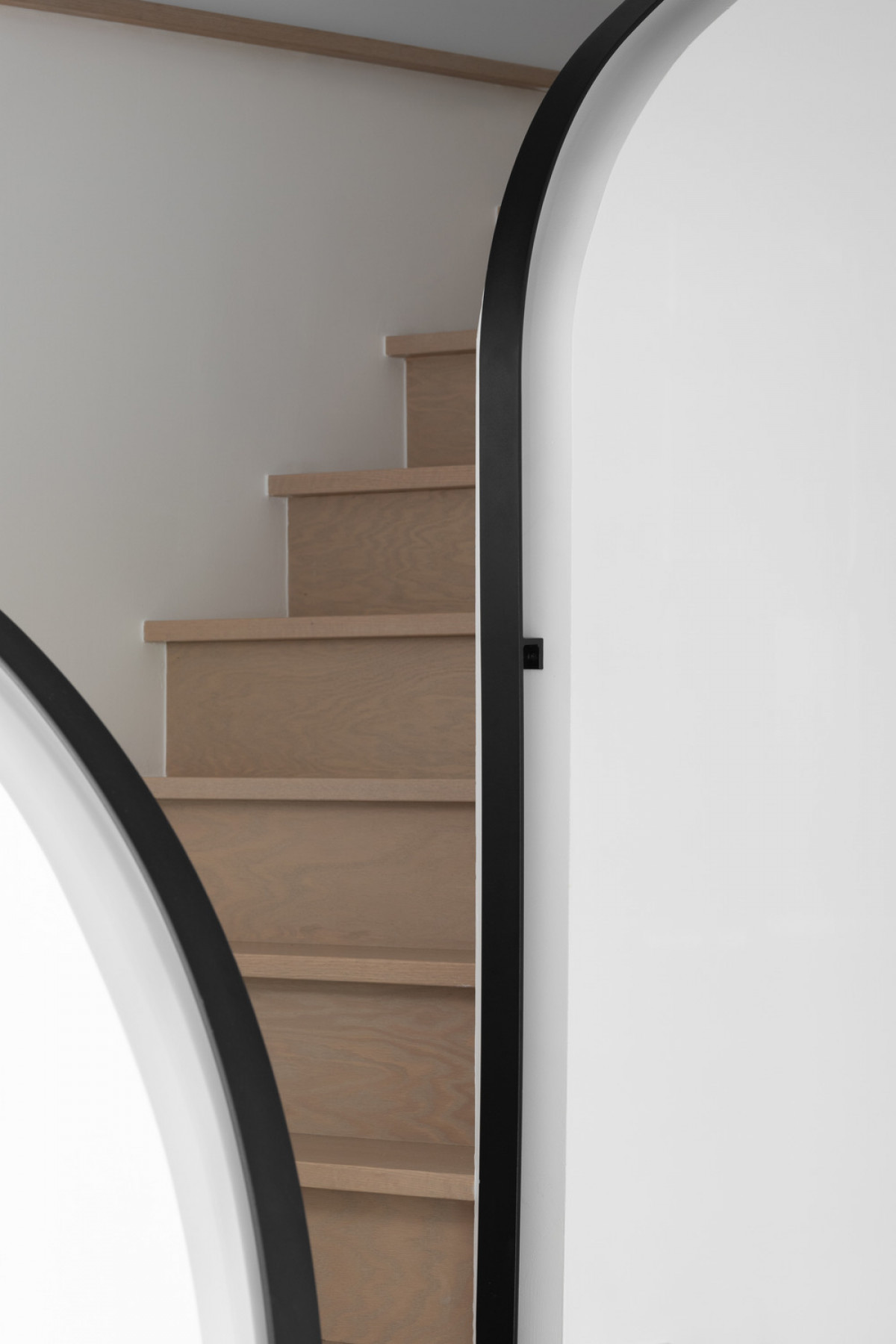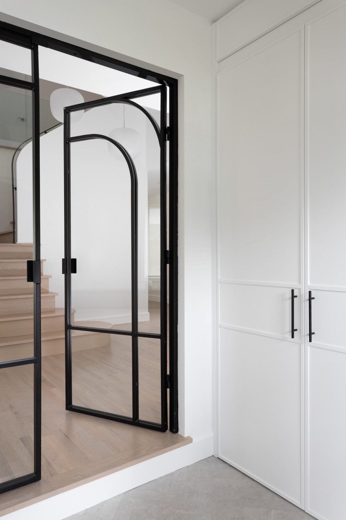 Imagine’s approach began with a complete redesign of the ground floor layout, with one exception, the placement and infrastructure of a staircase ascending to the second level. The original entrance to the home frames the staircase as an entry centrepiece, and newly installed double doors of glass and black metal framing further contribute to that visual presentation. While its positioning was retained, the staircase itself was given a very detailed facelift that sets the tone for transitions throughout the home. Curved maple landing steps begin the ascent on a staircase bordered by curved, bright white walls, contrasting black metal strip railing, and a back wall of glass providing transparency to the upper level.