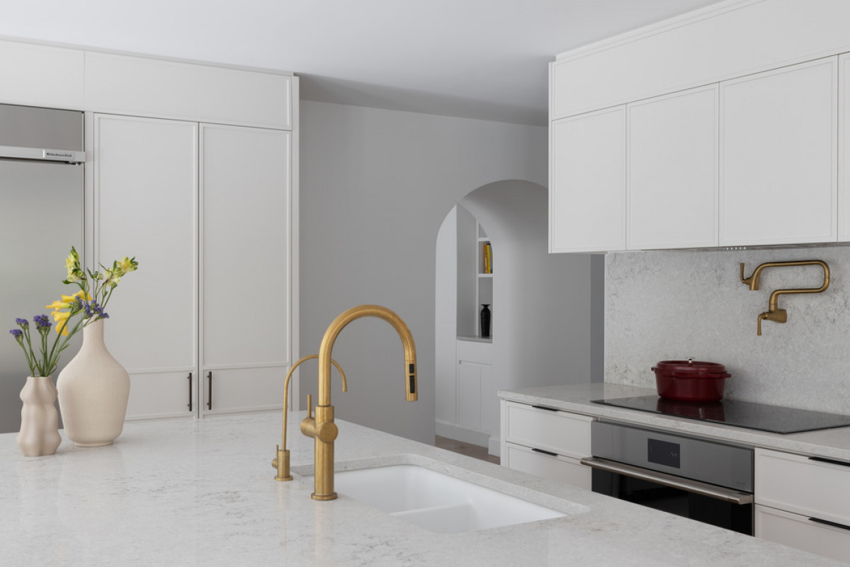 To the left of the staircase, a formal living room transitions into a more private family TV room. To the right, the kitchen is located behind the staircase. The bright kitchen features white walls, light-coloured hardwood floors, a quartz countertop and backsplash, brass shelving and faucets, and an integrated walk-in pantry. Black chairs and a black table base in the adjacent breakfast nook provide a stark contrast to the bright white kitchen. From the kitchen, a large archway transitions to the formal dining room as one of the multiple archways that serve as transitional demarcations between the ground floor living spaces, all appointed with custom-designed furnishings.