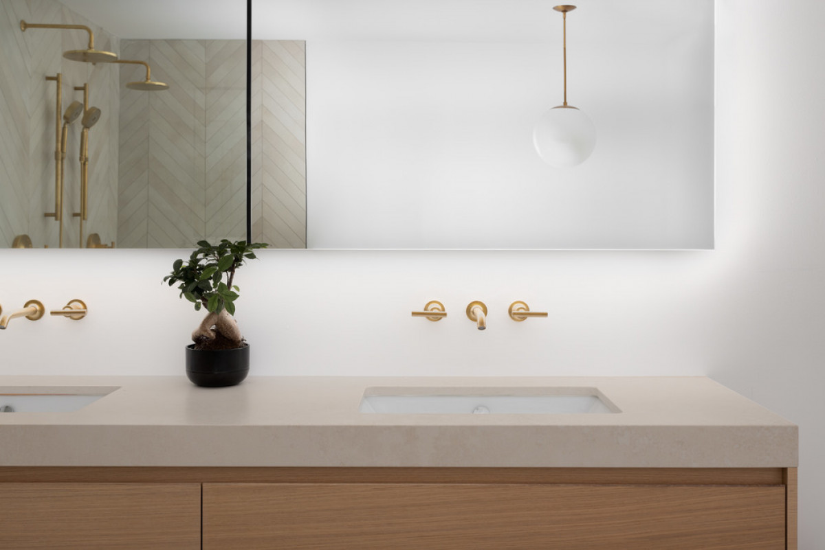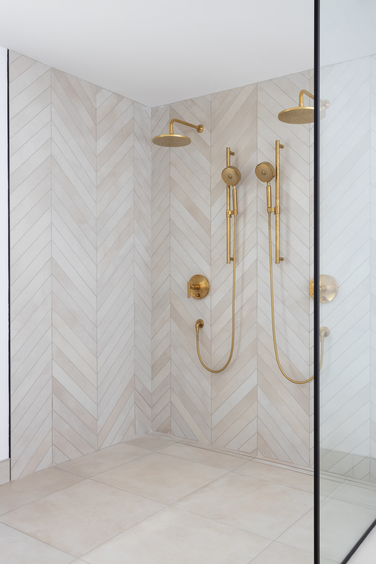 The upper level of house Rio is comprised of a master bedroom and bathroom, three additional bedrooms with two additional bathrooms, an office, and a laundry room. The master bathroom was a point of focus, and Imagine designed a layout that featured a double shower, a large freestanding bathtub, a double vanity with multiple storage components, and a retro lighting mirror, all highlighted in a seamless continuation of white, beige, and brass. The base of the shower features light-coloured tiles, with the walls adorned with the same tiles, but in a herringbone form.