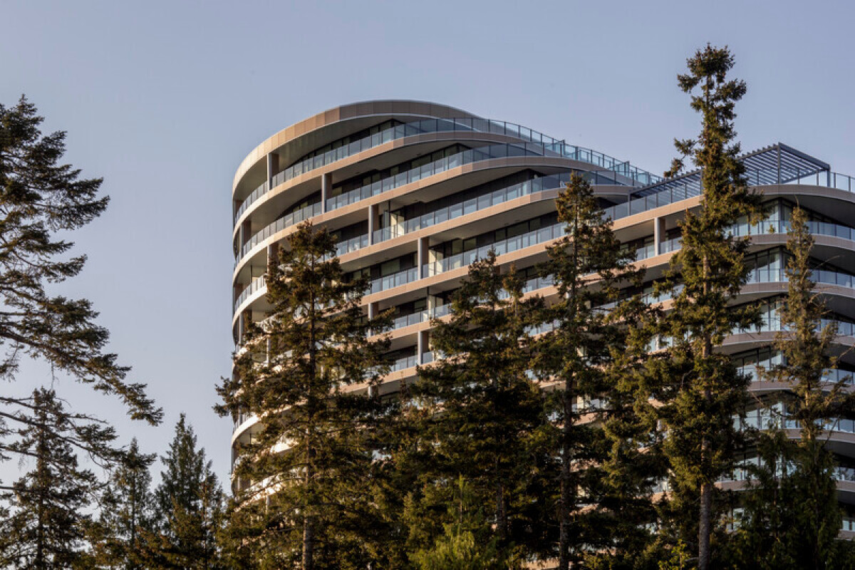 The first concrete building to rise at Bear Mountain in 15 years, the One Bear Mountain project unfolds in continuity with the 18th hole of the prestigious PGA Mountain Course, designed by Nicklaus Design. To this domesticated landscape component, the architecture—with its rounded forms—responds with coherence, establishing a dialogue with the site’s topography, the sweeping lines of the golf course, and the natural beauty of Goldstream Provincial Park.