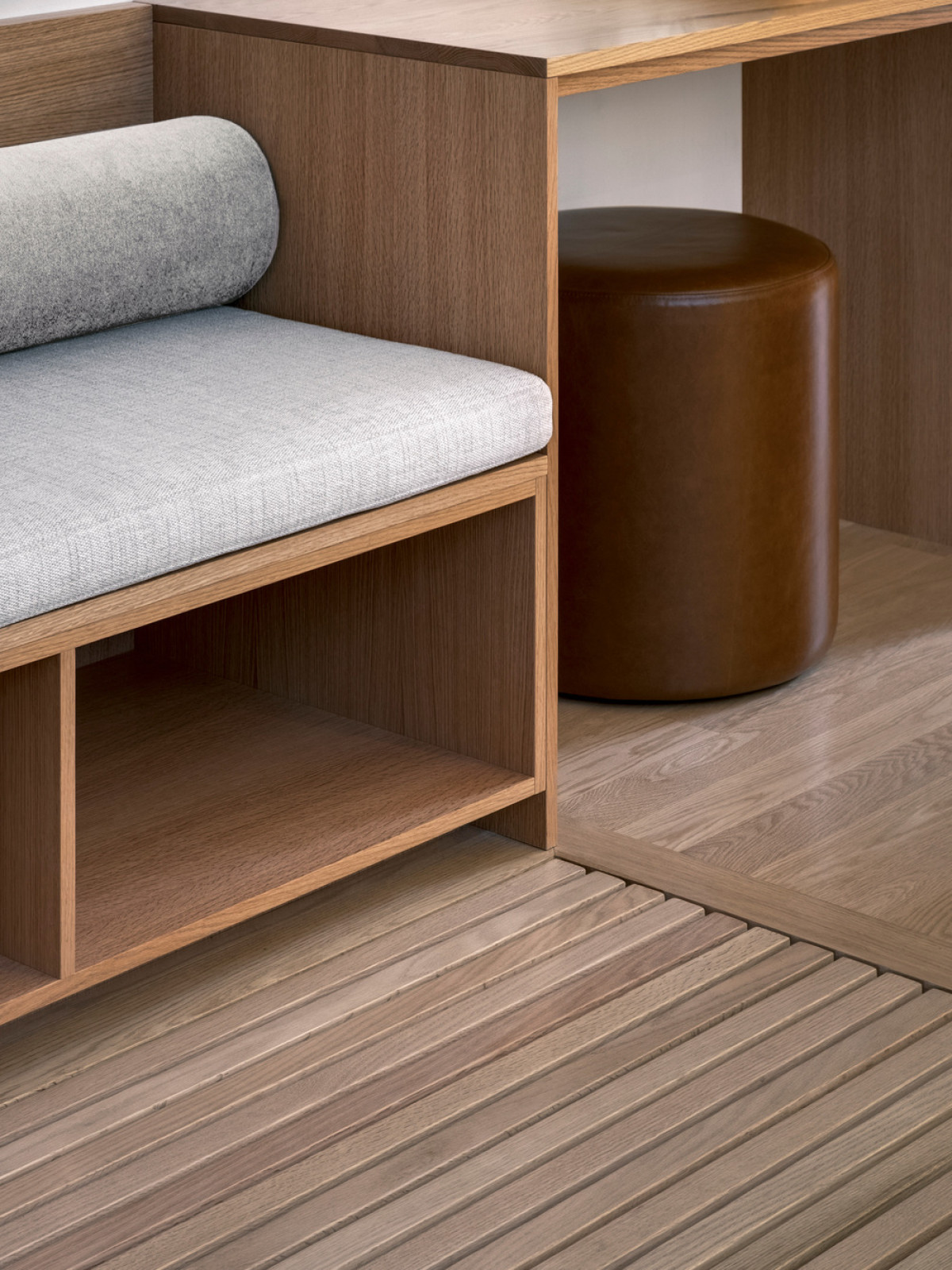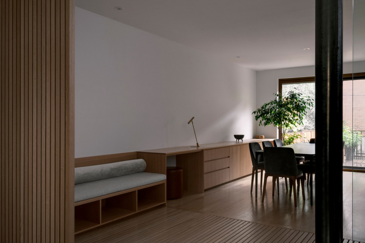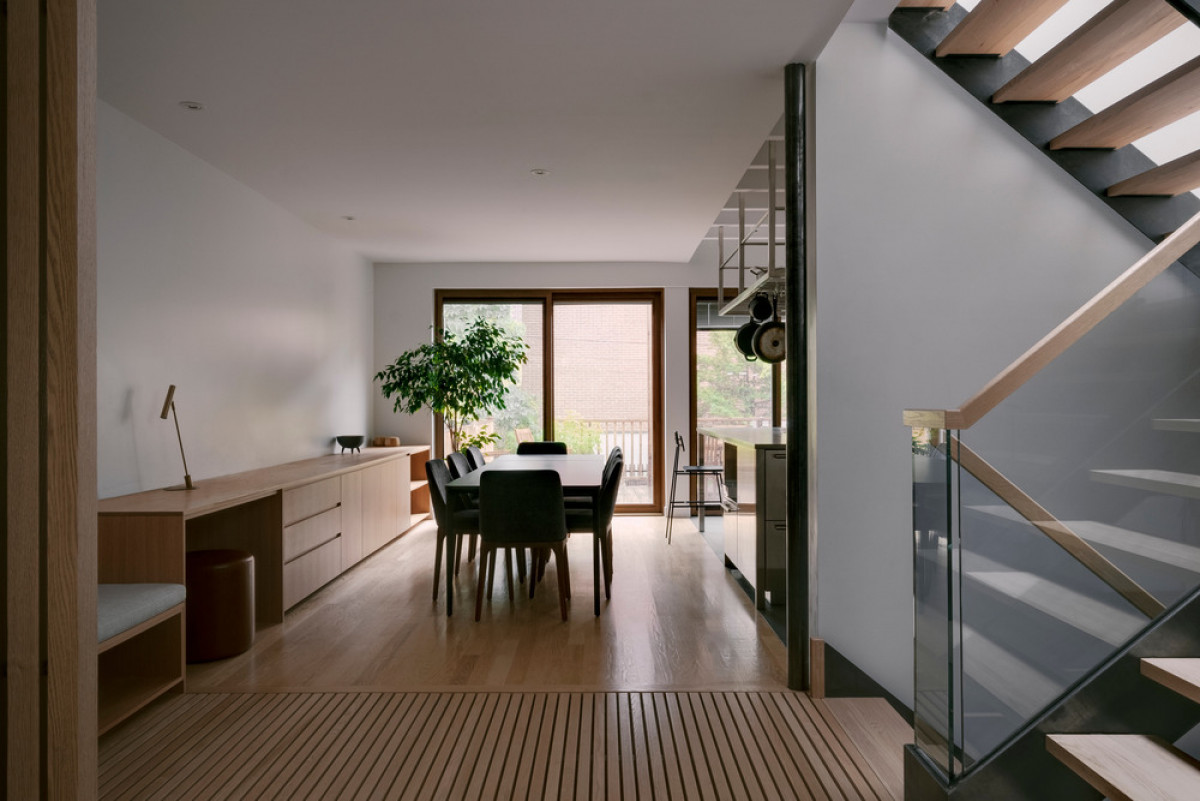 One of the project’s main components is its integrated furniture, situated on the ground floor. A hybrid space, it answers the family’s need for storage and for office space in the living area. APPAREIL Architecture created wooden furnishings with horizontal lines that host a couch, a desk, a buffet, and storage spaces. An elegant and efficient design that cleverly optimizes the space.