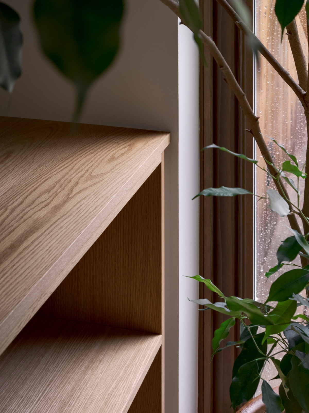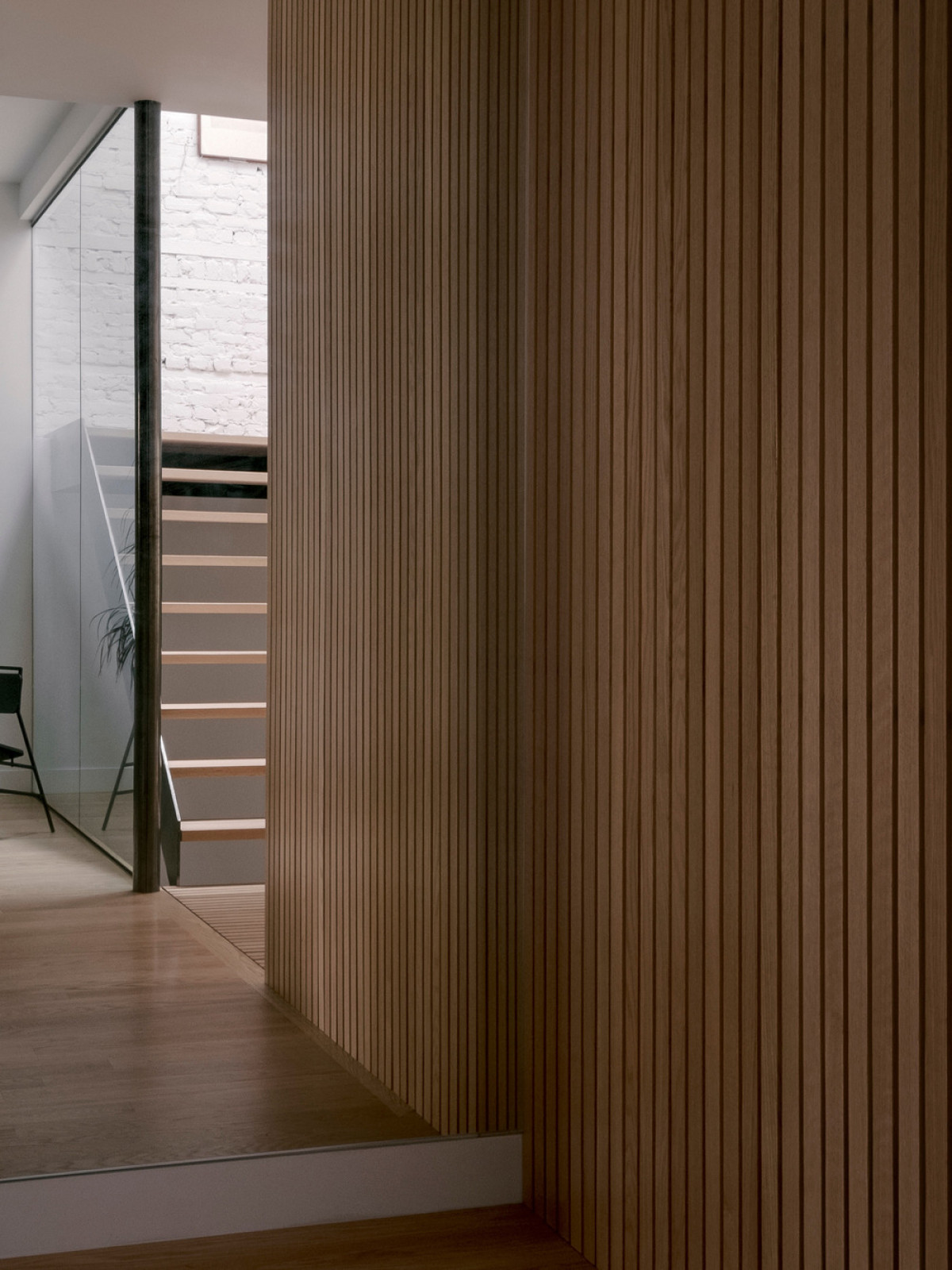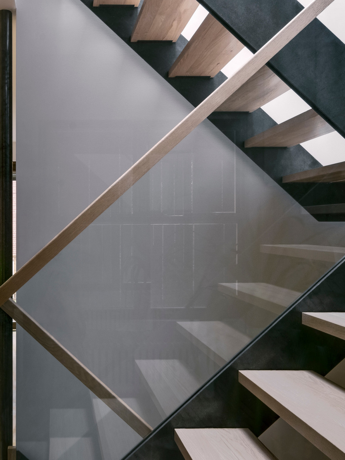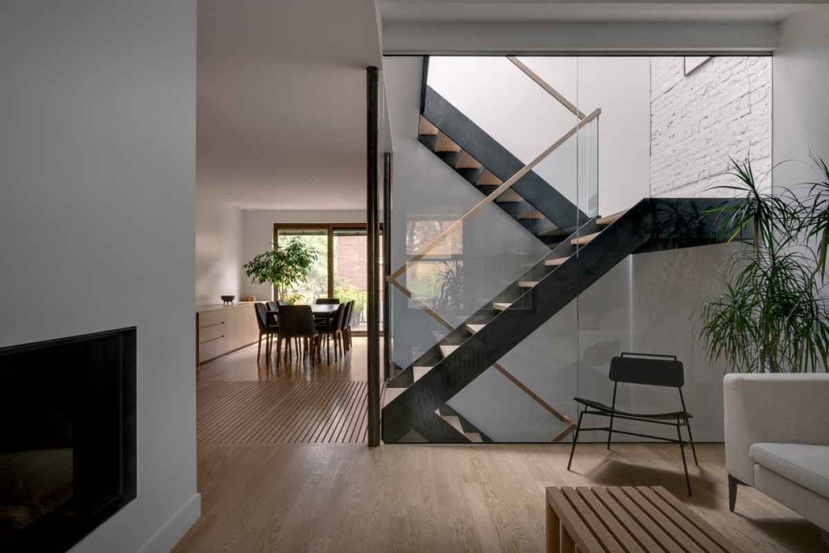 The central staircase plays an important role: it is the link between the spaces. While segmenting the kitchen and the living room without completely sealing them off, it creates a connection between the levels and adds movement. It was left open to allow the light from the light shaft to cut across all levels down to the basement. Its steel, wood, and glass materiality bring clarity to space while reinforcing the connection between the different rooms.