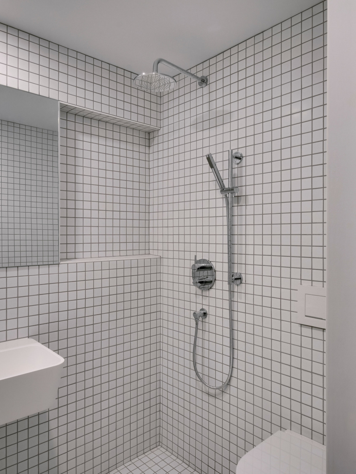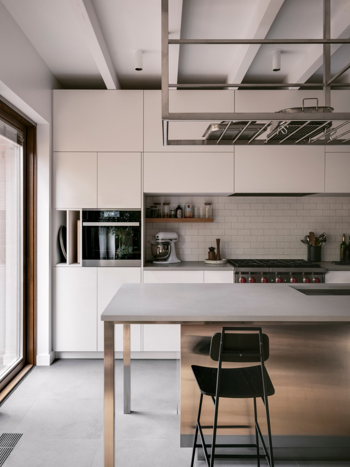 The kitchen was bespoke to respond to the clients’ desire to have a professional, bullet-proof kitchen, that could host and respond to the whole family’s needs. At its heart, an enormous island renders the space functional and full of character. Made of stainless steel, it contributes to an industrial aesthetic that contrasts with the white and the residential wood surrounding it, bringing a balance between a cold and a warmer physicality to the space. With the aim of creating a friendly and bright space, the opening onto the back garden has been highlighted.
