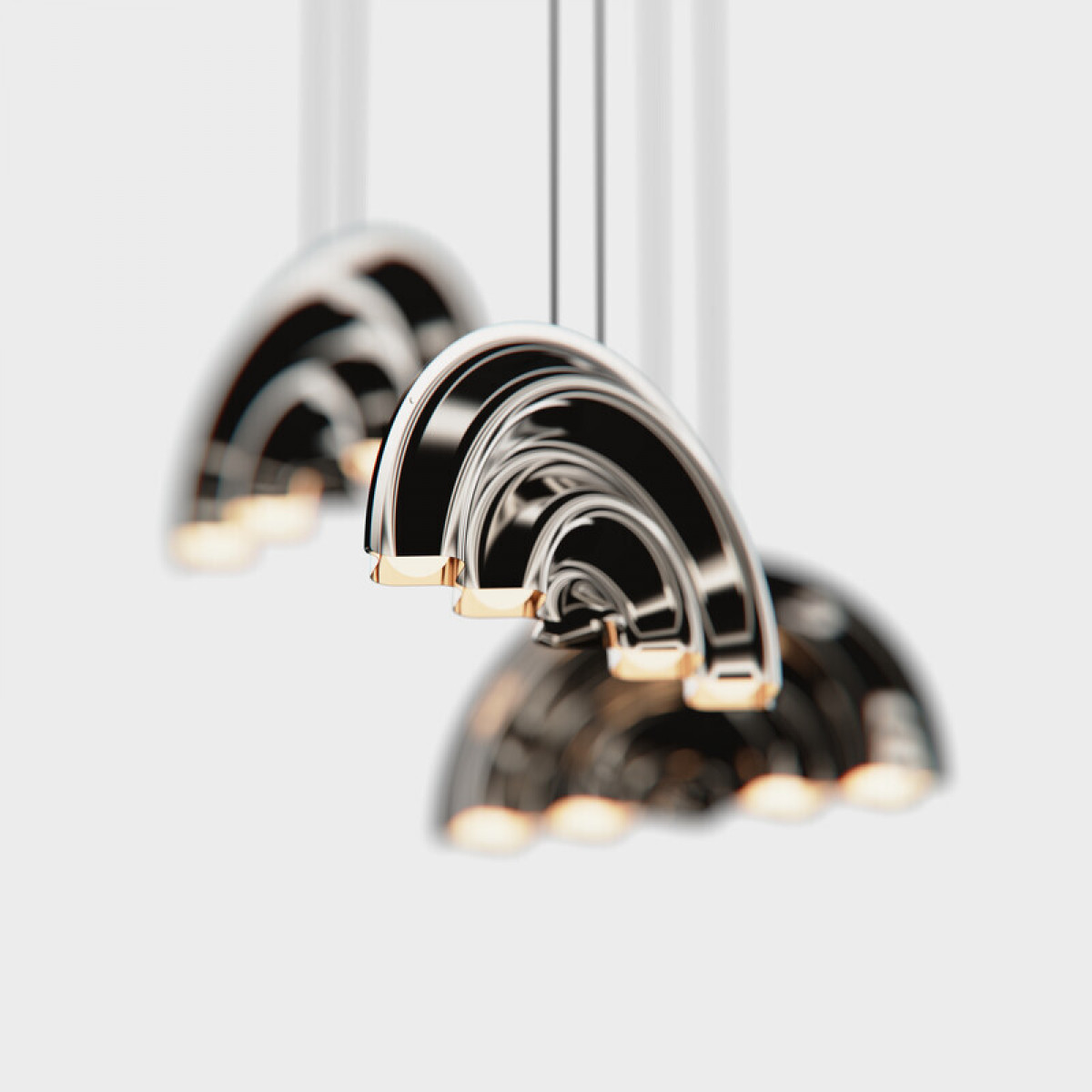 The inaugural collection, Doppler, channels the Doppler effect and reveals artwork that embodies the very essence of water: a brilliant shine associated with fluidity and surprising light reflections. Over several months of communication and knowledge transfer, artist Florian Martin and d’Armes developed this collection. Whether in the forms of singular or triple pendants, floor lamps, or sconces, each Doppler piece beckons exploration of shape and perspective, unlocking a world of creative possibilities.