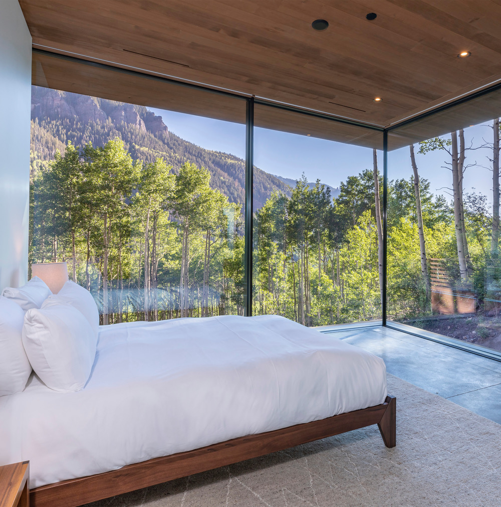 The interior of the glass pavilions features Northern cedar flat ceiling planes, designed with recessed lighting to eliminate any hanging obstructions to the breathtaking views. The wide-open floor plate is framed in glass courtesy of window panels separated by minimal ¾” wide mullions, providing uninterrupted horizontal views to the south, where only Aspen trees rise in vertical contrast. At more than 9,000 feet of elevation, the insulated window panels presented another challenge, resolved through the insertion of capillary tubes to mitigate atmospheric pressure differences between the manufacturing site of the insulated-glass units and the high altitude of the house.