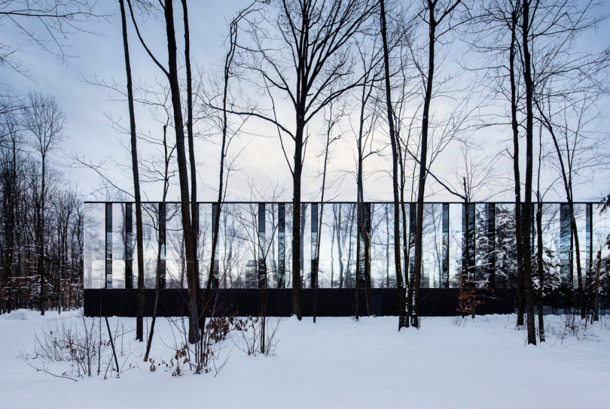 A large opening spans the building from one façade to the other, allowing natural light to reach the core of the building where the public spaces and double-height plant laboratory are located. CNIMI’s side façades are covered with mirror-polished aluminium, reflecting the trees and helping to visually enhance the density of the wooded area. At both ends of the central space, glass façades open onto the neighbouring forest, which becomes an integral part of the interior decor.