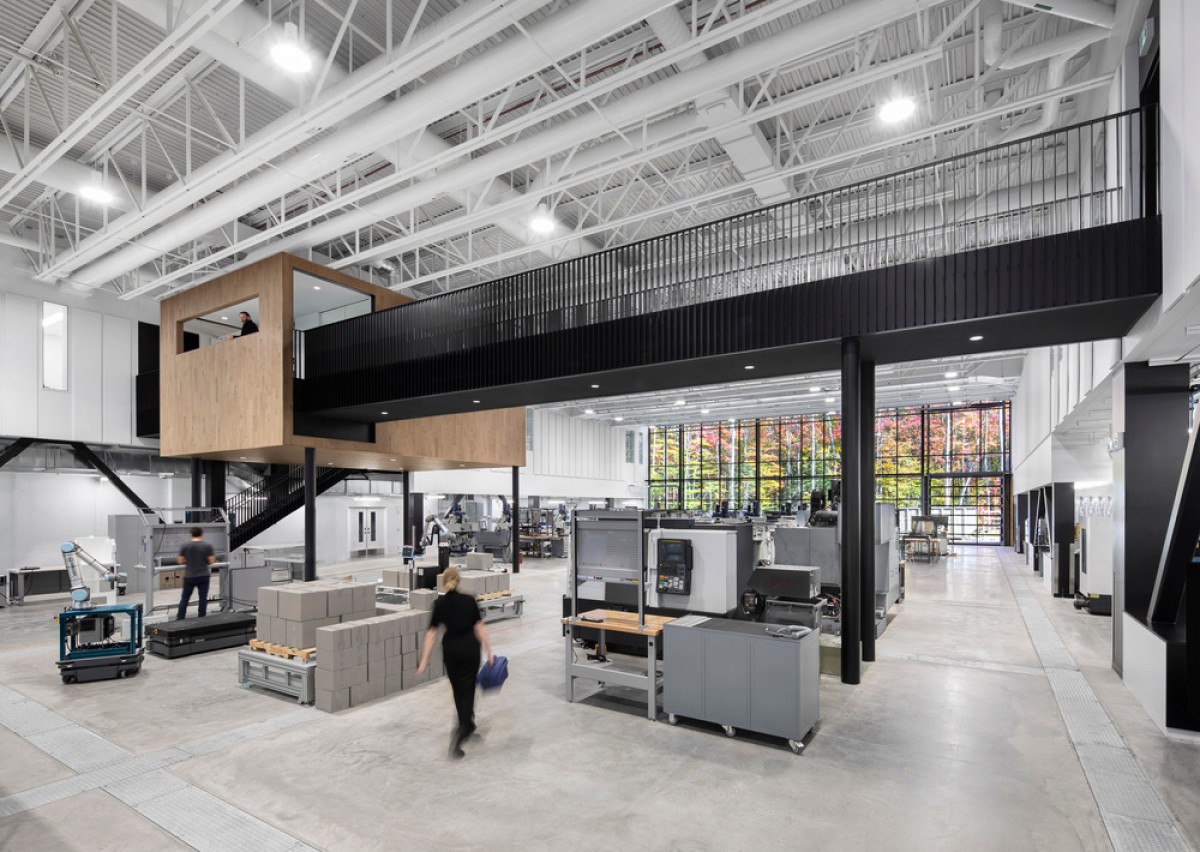 NFOE Inc. unveils the Centre national intégré du manufacturier intelligent (Integrated national centre for intelligent manufacturing), a new Université du Québec à Trois-Rivières (UQTR) building which began construction in 2019. The new CNIMI building connects through a tunnel to a neighbouring building on a wooded site on the UQTR Drummondville campus.