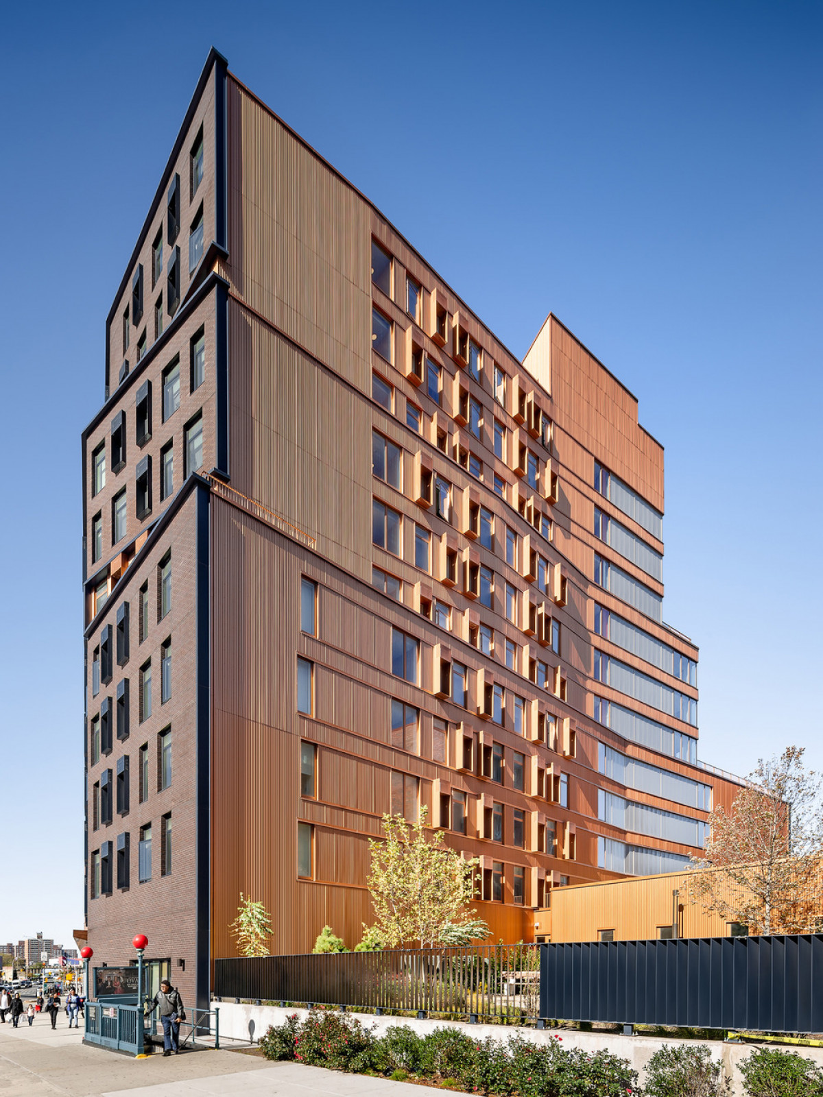 The materials used at Tres Puentes include the elegant brickwork of their street facades, like many of its historic townhouse and NYCHA neighbours, while the facades towards the site’s gardens are clad in copper and navy-blue corrugated steel panels—a nod to the industrial Mott Haven. Tres Puentes was recognized with a SARA Design Award in 2022.